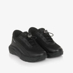 Black faux leather trainers for boys and girls by Calvin Klein. They have elasticated laces for easy pull on, with a velcro strap for quick fastening. Lined in soft textile, they have padded insoles for comfort and non-slip rubber soles for good grip. The brand's signature CK monogram appears on the side, with their logo name across the velcro strap.