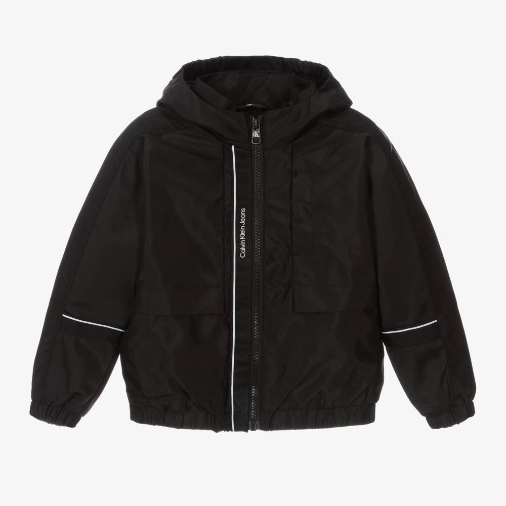 Black nylon windbreaker jacket for boys by Calvin Klein, with white stripe trim. Made from recycled material, both the outer shell and the inner lining is silky smooth. The jacket has a chunky front zip closure and popper fastening pouch pockets. The hem and cuffs are elasticated to help keep out chilly winds. For a signature look, there is a logo print down the front and a monogram zip puller.