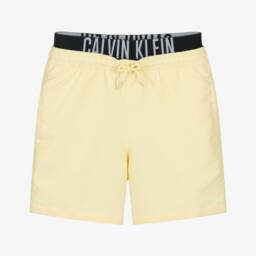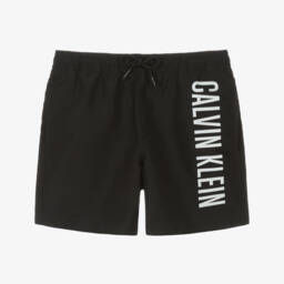 Black and white swim shorts for boys by American designer Calvin Klein, with a bold logo print on the front. Using recycled material, they are made in water repellent fabric for quick drying, with a soft mesh lining. The waistband is comfortably elasticated and has drawstring ties for an ideal fit. There are useful side seam pockets, with an additional velcro-fastening pocket on the back.