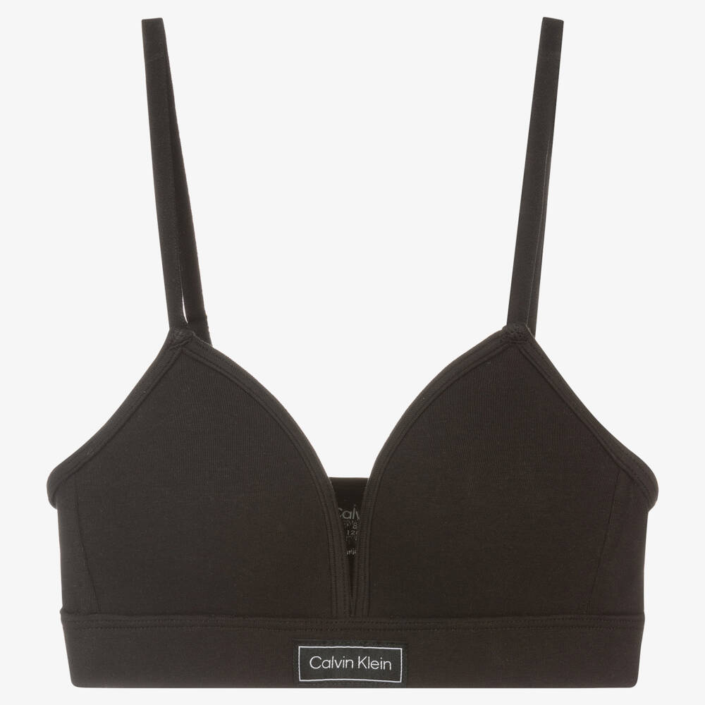 Stylish cotton bra for girls by American brand Calvin Klein. Lightly padded in triangle shaped cups, it has a black and white logo tab on the front. Comfortable and easy to pull on, it has soft and stretchy cotton jersey back strap, with fixed, adjustable shoulder straps.