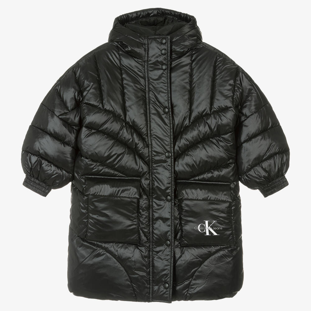 A black oversized hooded puffer coat for girls by Calvin Klein that fastens with a two-way zip and poppers. Soft and mid-weight, it has large patch pockets with concealed popper fastenings and is printed with an iconic Calvin Klein monogram logo. Fully lined, there are elasticated cuffs to keep the cold out. This item is made from recycled nylon with 90% REPREVE recycled polyester for the padding.