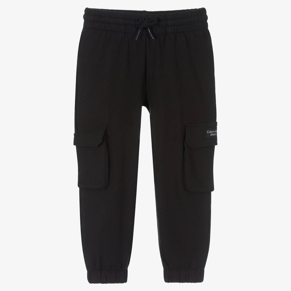 Cool black joggers for girls by Calvin Klein Jeans, featuring the brand's signature logos. Made in soft cotton jersey for a comfortable fit, these casual joggers have utility-style pockets on the legs, and a stretchy drawstring waist ideal for lounging.