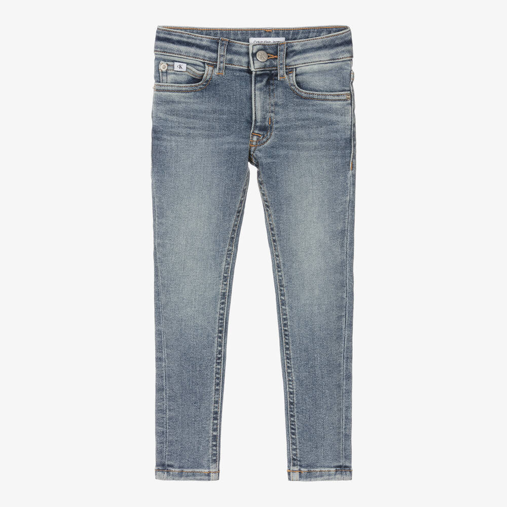 Stylish light blue wash jeans for girls from Calvin Klein, in a mid-rise skinny fit. The iconic CK monogram is embroidered on the back, with a small tab on the coin pocket and embossed silver rivets for a classic, logo inspired look. Fastening with a branded button and zip, the waistband is adjustable for a good fit. Made in soft and stretchy denim with at least 20% certified recycled cotton, this five-pocket style is slim through the hips and thighs with skinny legs.