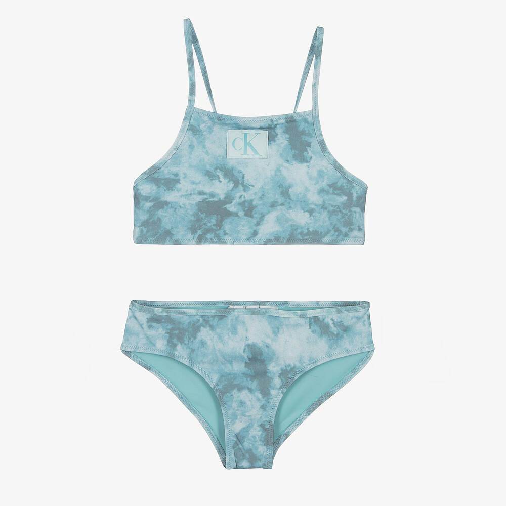 Eye-catching blue bikini for girls by Calvin Klein, with an embroidered logo patch on the front. Ideal for cool beach and pool wear, it has a beautiful tie-dye effect print. For comfort, it is made and lined in silky stretchy fabric, with cross-over straps on the top for a stylish finish. The outer fabric of this product is made from at least 75% recycled polyamide.