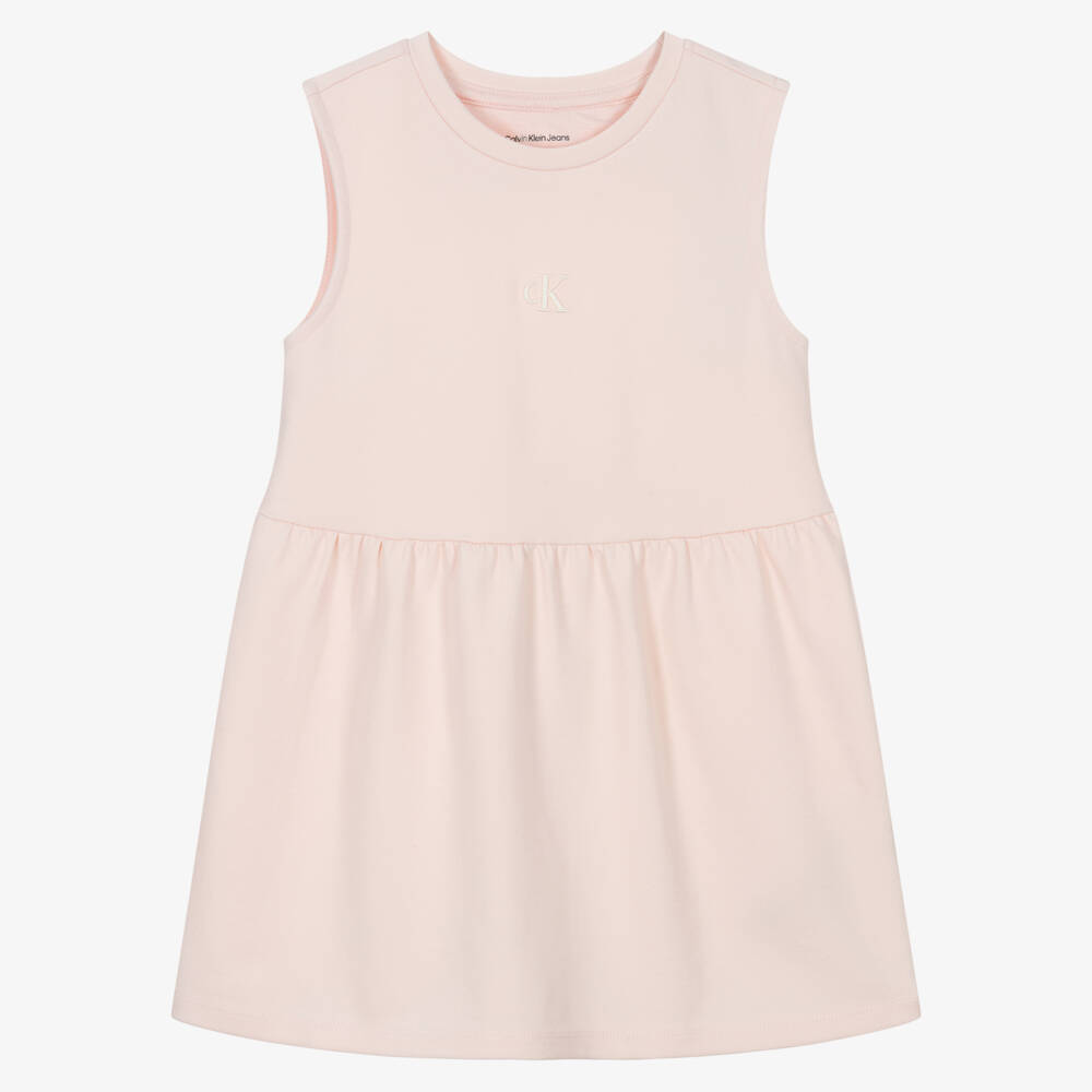Lovely pale pink Milano jersey dress by Calvin Klein. Soft and stretchy, it features an embroidered CK monogram on the front. There are matching branded jersey knickers offering comfort.