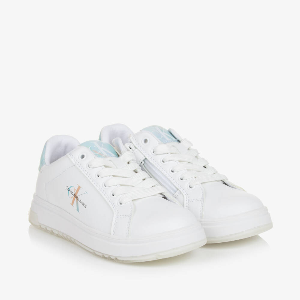 White trainers for girls by Calvin Klein, made from smooth faux leather. Simply styled, they have a pale blue and orange Calvin Klein monogram on the side, a marble-effect logo patch on the tongue and a matching trim on the heel. Lined in soft twill, this casual lace-up style has side zip and velcro tab fastenings for easy wear, and transparent non-slip rubber outsoles for good grip. This product was made from at least 50% recycled polyester.