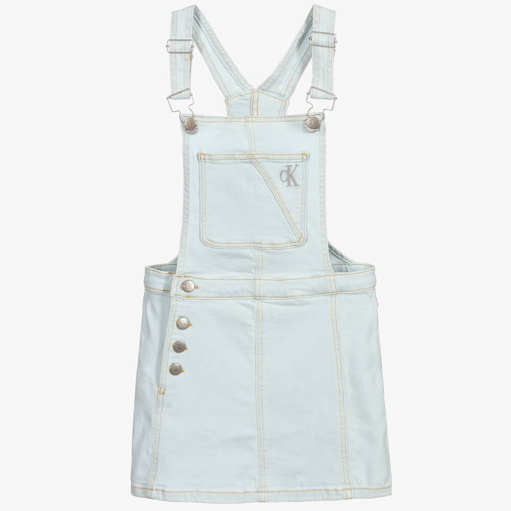 Teen girls bleach blue, dungaree style pinafore dress by Calvin Klein Jeans, in stretch denim. This versatile mini dress has a bib and adjustable shoulder straps with metal clip fastenings. There is grey logo embroidery on the front and logo patches on the back. It fastens with metal logo embossed buttons on the side.