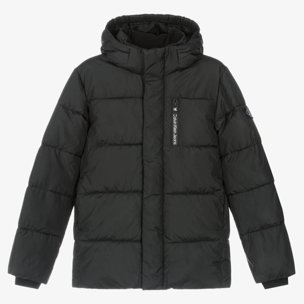 From American brand Calvin Klein, a black puffer jacket for teen boys. For a distinctive designer look, it has a white logo print on the zip-fastening chest pocket and an embroidered logo patch on one sleeve. Made in silky smooth fabric, this warmly padded jacket has a removable hood, ribbed cuffs and popper-fastening pockets with a fleece lining. The fabric and lining are made from 100% recycled polyester and the insulation is made with 90% REPREVE recycled polyester.