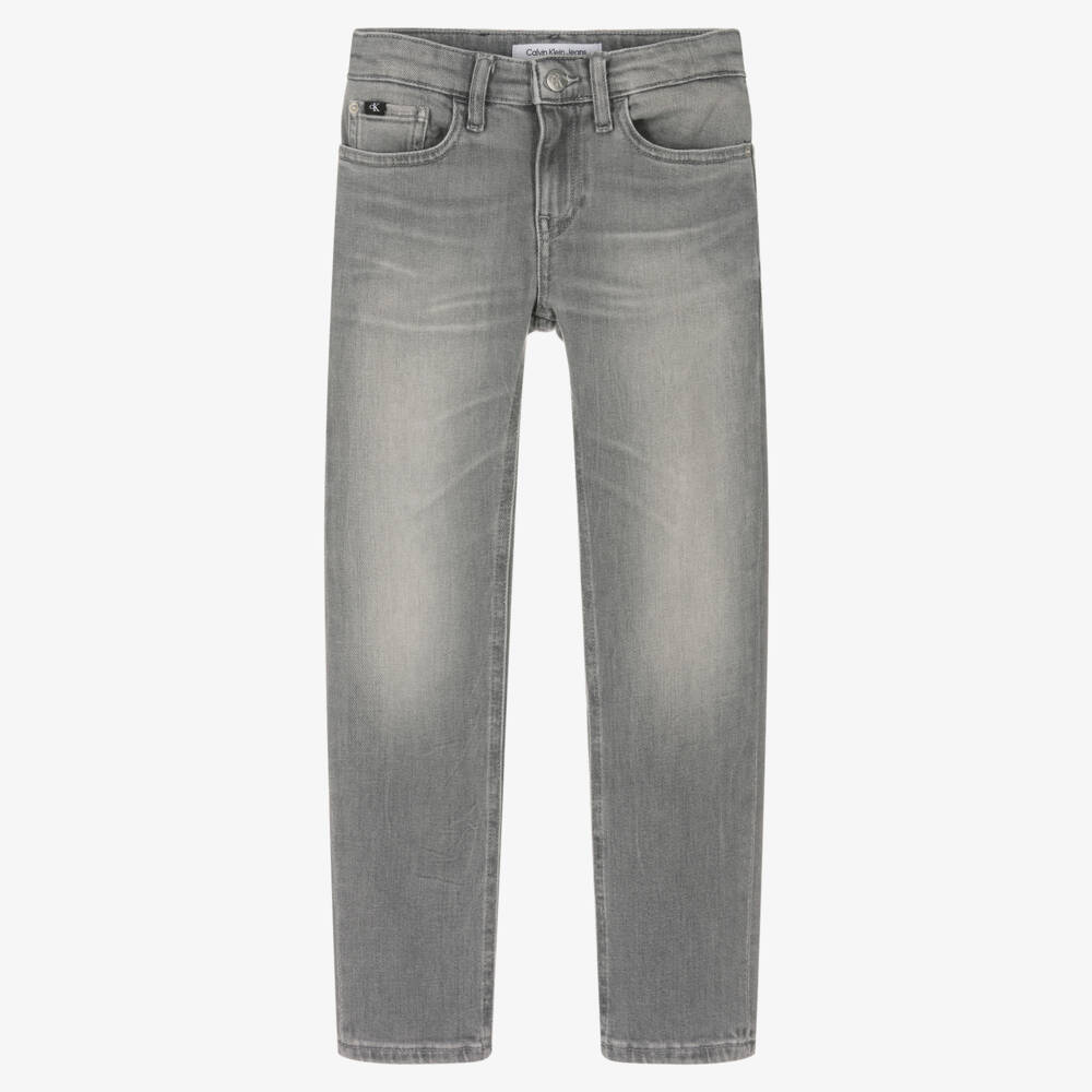 Light grey denim jeans for teen boys from Calvin Klein Jeans, with a black, white and grey logo jacron on the back. Slim-fitting, they have classic five pocket styling and are made in soft cotton with a slight stretch for comfort. They have an on-trend faded appearance and zip and branded button fastening on the front. There is a small logo tab on the coin pocket for a finishing designer touch.
