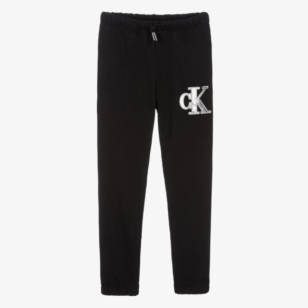 Casual and comfortable for teen girls , these black cotton joggers are by American designer Calvin Klein. They have a metallic silver CK monogram logo appliquéd on one side for brand recognition. Made in soft mid-weight jersey, they have an elasticated drawstring waist for an ideal fit, with side seam pockets and an additional pocket on the back.