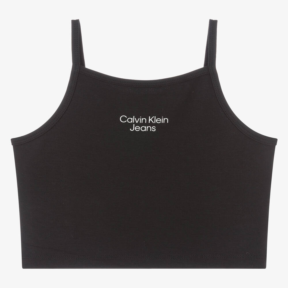 Cool black top for teen girls by Calvin Klein Jeans, made in soft and stretchy jersey. The American brand's bold black logo lettering decorates the front. In an on-trend cropped fit, this stand-out top has narrow shoulder straps and a feminine square neckline. This product is made with 70% sustainable materials including 66% Lenzing™ ECOVERO™ fibres.