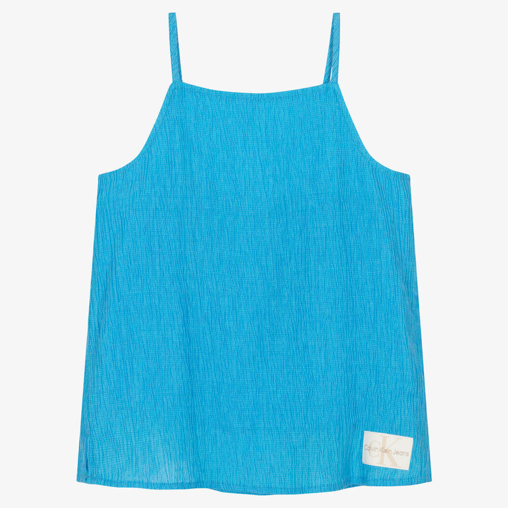 Blue vest top for teen girls by Calvin Klein Jeans. A unique textured finish, this strappy top is made in soft and lightweight, crinkle-effect fabric, great for casual wear in warmer weather. The soft voile front lining, adjustable straps and vented sides ensure this top will as be comfortable as it is stylish. An ivory monogram logo patch is stitched on the hem to complete the look. Eco-conscious, it is made with at least 50% Tencel Lyocell.