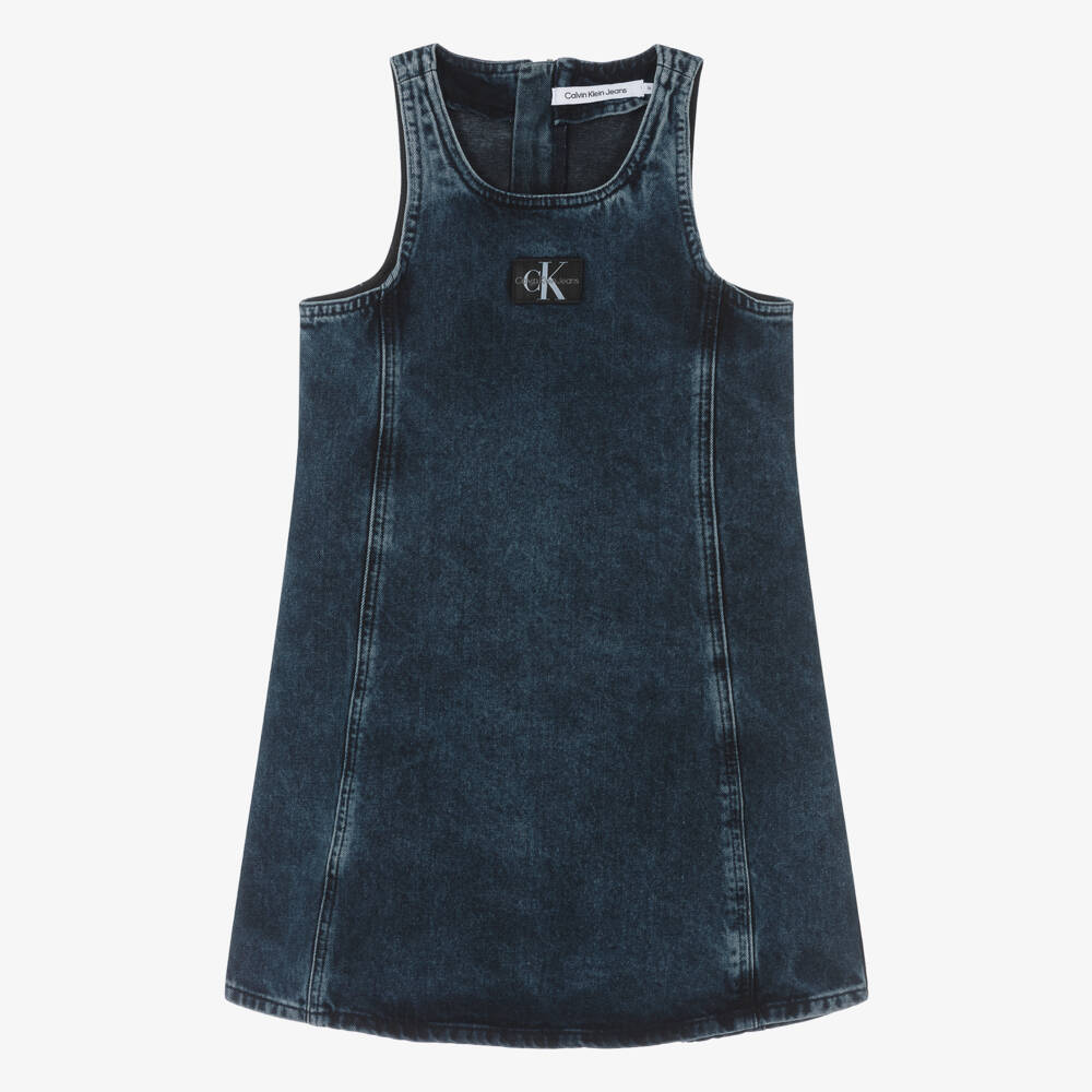 Both cool and casual, this dark blue denim dress for teen girls is by American brand Calvin Klein, with a black and white monogram logo sewn on the front for instant brand recognition. Made in mid-weight cotton twill, it has a washed and worn look, with panelled detailing on the front and back and fastens with a concealed zip on the back. The dress can be worn alone or styled and layered with a top for a different look.
