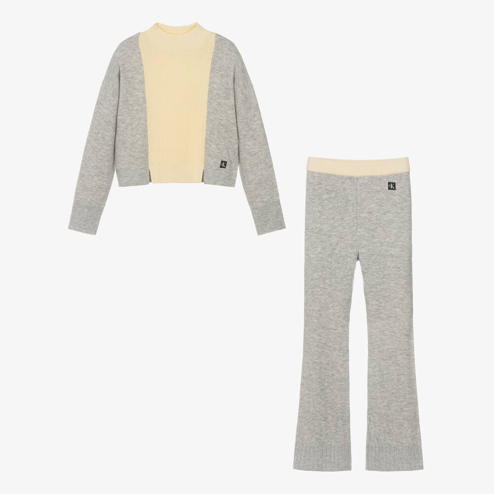 Cosy and comfortable for teen girls, this grey marl fluffy-knit trouser set is by American designer Calvin Klein. The sweater has a ribbed ivory panel on the front and back, with vents on the front hem for ease of movement. The trousers have an ivory elasticated waist and deep ribbed hems. Both pieces are finished with a CK monogram patch on the front for brand recognition.