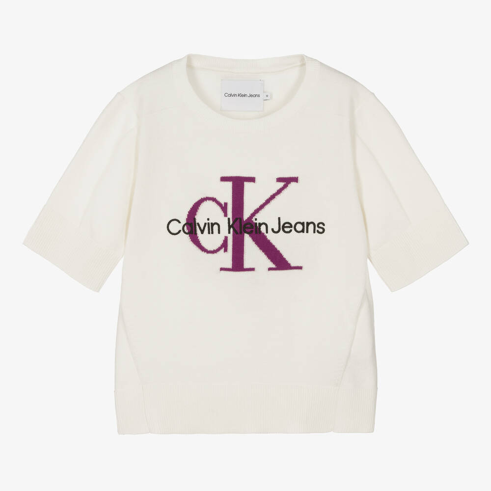 Ivory short-sleeved jumper for teen girls by Calvin Klein Jeans. Styled as a T-shirt, this cool piece is softly knitted in lightweight, breathable cotton with ribbed trims and a crew neckline for an unexpected textural design. A purple intarsia Calvin Klein monogram logo can be found on the front, with black embroidered branding above. It is structured with shaped panels for a flattering silhouette. It is made with 100% transitional cotton.