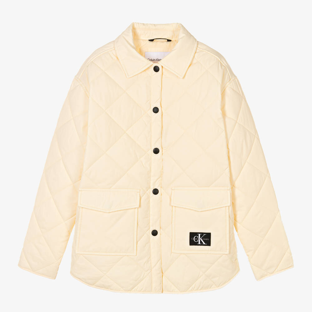 A diamond quilted dark ivory jacket for teen girls by American brand Calvin Klein, with contemporary styling. This lightly padded jacket is made in silky smooth fabric with a slightly shaped hem and contrasting black, branded popper fastenings. For a signature finish, the CK monogram logo patch features on one of the front flapped pockets. This item is made with at least 95% recycled fabric.