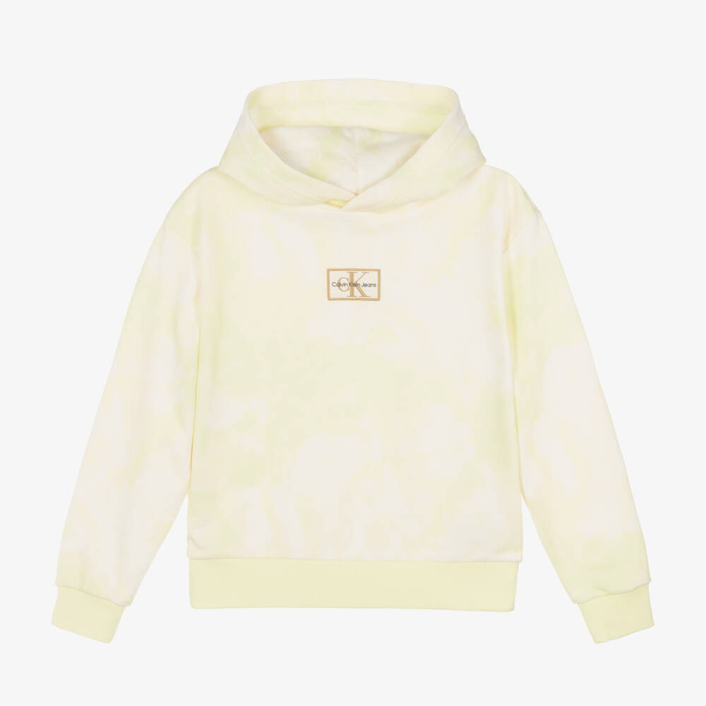 Streetwear inspired light green hoodie for teen boys and girls by Calvin Klein Jeans, with a recognisable ivory and gold CK logo patch on the front. Made in mid-weight cotton jersey, it has a stylish bleached look.