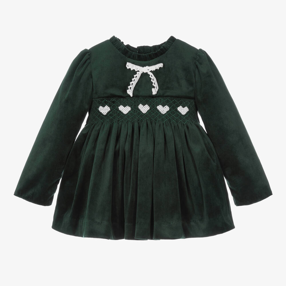 Sweet green dress for baby girls by Caramelo Kids, made in super soft velvet. It has a smocked panel on the front with white embroidered hearts, picot embroidery cuff trims and pretty bow. The skirt is lightly gathered to create pleats and volume for a feminine silhouette. The matching frilly knickers create a coordinated look.