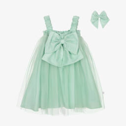 Sweet pale pink dress set for baby girls by Caramelo Kids, with sparkling diamantés and frills on the bodice. Made in soft, comfortable, ribbed jersey, the dress has gently elasticated, frilly cuffs and and useful, attached knickers. The gathered tulle skirt has a ribbed jersey bow on the waist. A coordinating, turban-style hat completes the set.