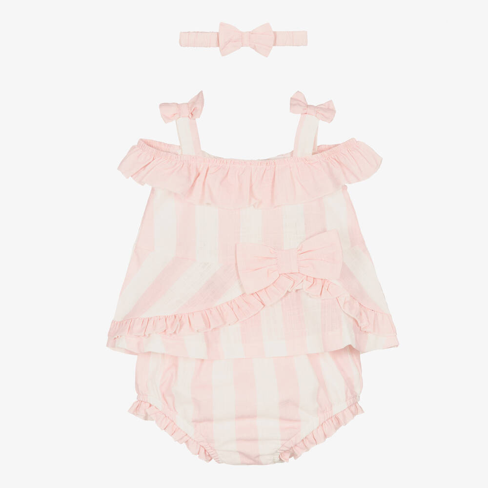 A sweet pink and white stripe shorts set for baby girls by Caramelo Kids, woven in soft and lightweight cotton. The open-shoulder top has pink ruffle trims and button fastenings on the back. There is a lovely pink bow on the front to match the shoulder straps. The paired shorts have an elasticated waist to sit comfortably on little tummies. The girly set is complete with an elasticated headband for a cute, coordinated look.