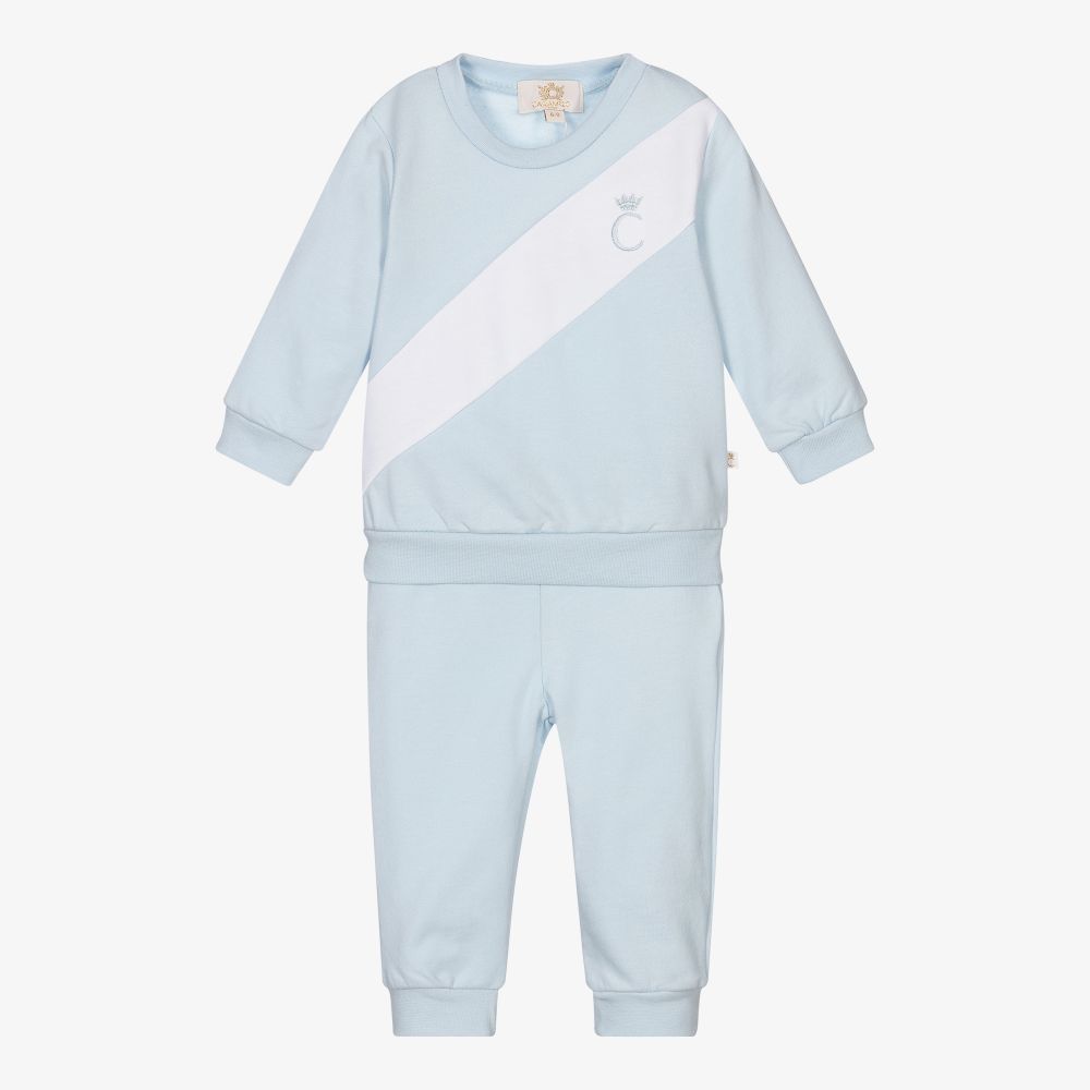 Pale blue tracksuit for boys by Caramelo Kids, made in soft cotton jersey with a brushed feel inside. The top has a white diagonal panel with a pale blue embroidered logo, and an embroidered logo tab on the side seam. The joggers have a gently elasticated waistband and ankle cuffs.