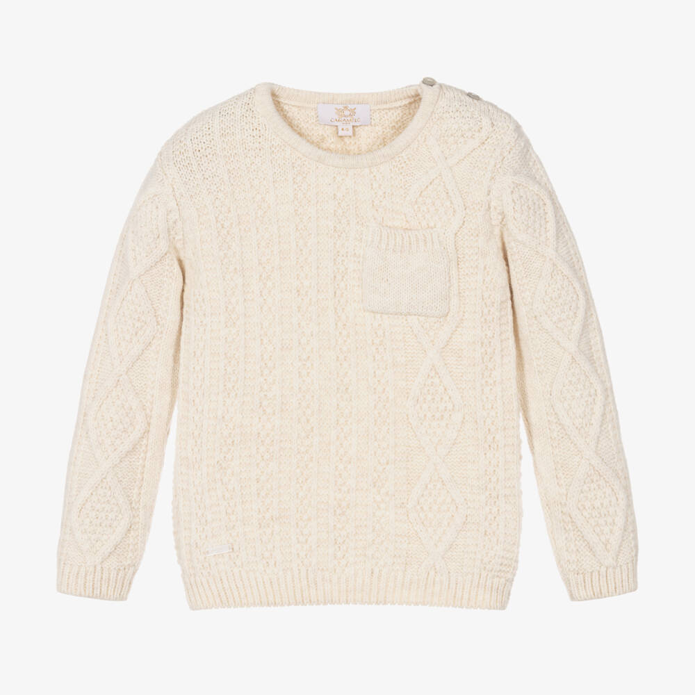 Lovely ivory sweater for boys by Caramelo Kids, knitted in a soft, mid-weight wool blend. Exclusive to Childrensalon, this warm and cosy jumper has a cable pattern on the front and sleeves and a little pocket on the chest. It has pearlescent button fastenings on one shoulder.