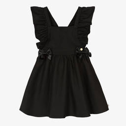 Girls navy blue pinafore dress by Caramelo Kids, trimmed with romantic ruffles and satin bows. The cross-over straps on the back fasten simply with buttons. An oversized bow appliqué, adorned on the back of the waist, completes the look.