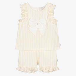 Summery yellow and white candy stripe shorts set for girls by Caramelo Kids. Made in soft cotton poplin, this charming outfit has a sleeveless top with pretty ruffle trims and a large white bow on the front. The matching shorts have ruffle trims, useful front pockets and a gently elasticated waistband for a comfortable fit.