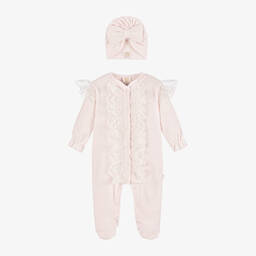Eye-catching pale pink cotton babygrow for girls by Caramelo Kids, with scalloped, embroidered, ivory tulle trims. Made in soft, comfortable jersey, it has gently elasticated, frilled cuffs. There are easy-to-use popper fastenings on the front and between the legs. A coordinating, turban-style hat with an oversized bow completes the set.