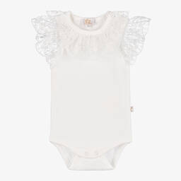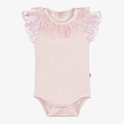 Gorgeous pink bodysuit for little girls by British brand Caramelo Kids. Made in comfortable cotton jersey, it has a beautiful ruffled lace collar, with matching ruffles over the shoulders. It fastens between the legs with poppers, so never becomes untucked. A white fabric tab with a glittery gold logo is on one side seam.
