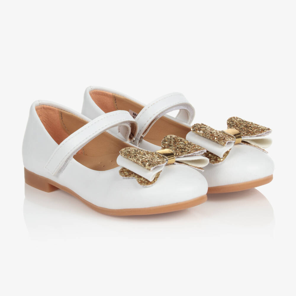 Exclusive to Childrensalon, white ballerina pumps for girls by Caramelo Kids. Made in soft faux leather, the inner sole is lightly padded for comfort and they have a strap across the foot which fastens with velcro for ease. They have cute gold glitter detailed bows on the front for added glamour.