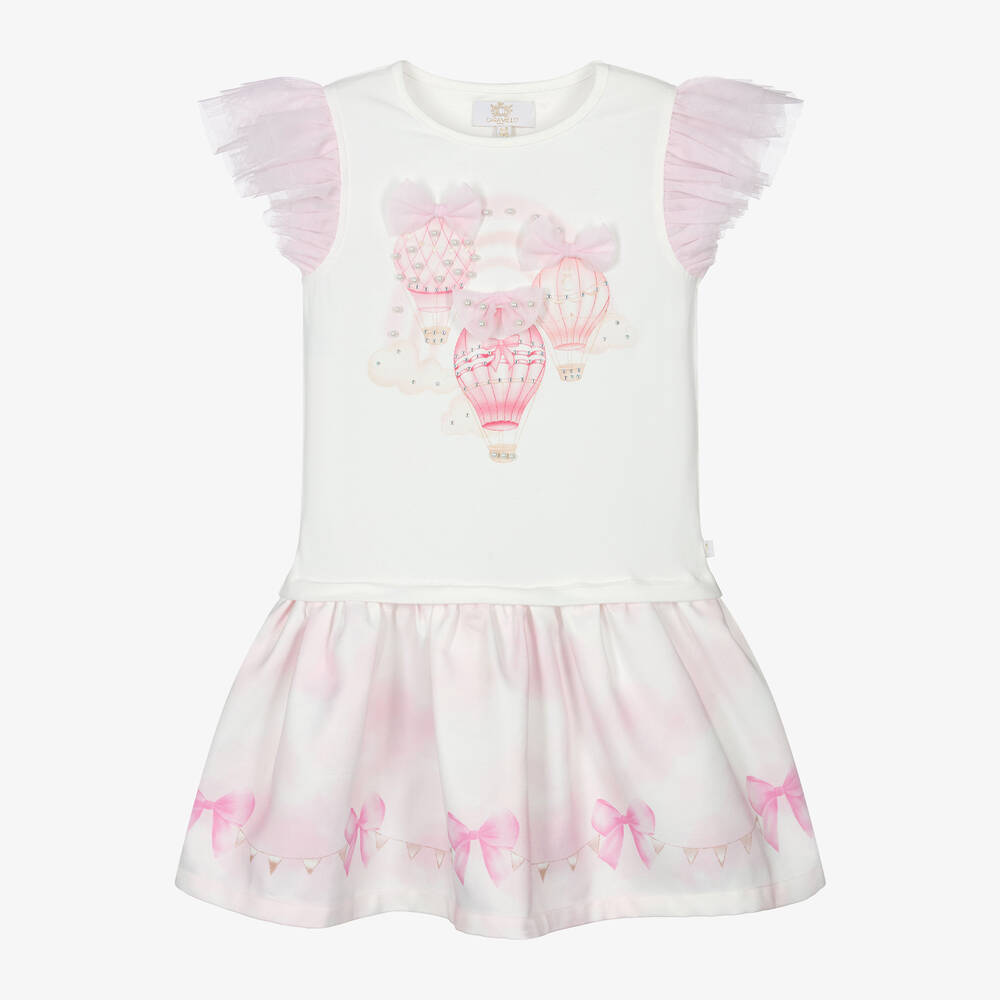A lovely white and pink dress for girls by Caramelo Kids. Comfortable to wear, it has a soft jersey bodice with delicate, ruffled tulle sleeves and a pink balloon print, trimmed with tulle bows, pearl beads and sparkly diamanté. This drop waist design has a gathered satin twill skirt with a mottled pattern, and bows and bunting around the hem.