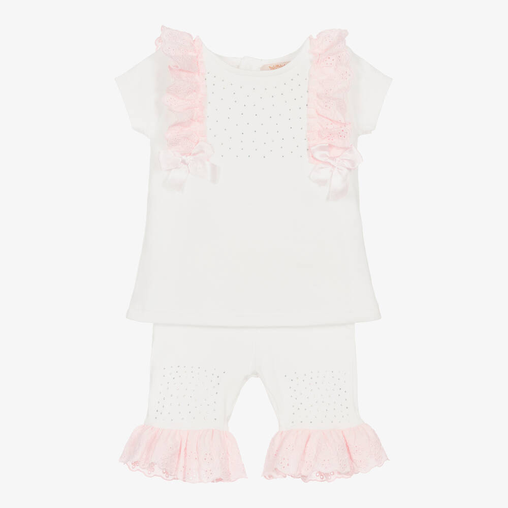 Girls ivory top and leggings set by Caramelo Kids, with pink broderie anglaise, ribbons and diamanté. The set is made in soft and stretchy cotton jersey and the top fastens with poppers on the back.