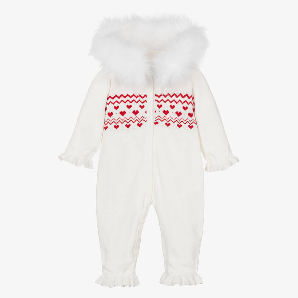 Pretty ivory hooded pramsuit for baby girls by British brand Caramelo Kids. Made in a soft, lightweight cotton knit, it has a red zigzag and heart pattern across the front and sweet ruffles on the cuffs. Lined in soft jersey, it has a detachable faux fur trim on the hood and fastens on the front with a zip.