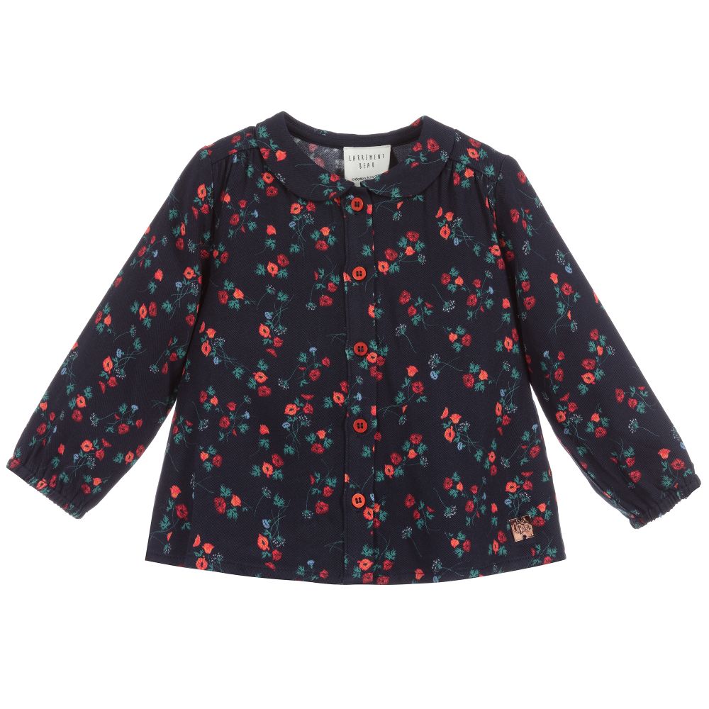 Younger girls navy blue blouse from Carrément Beau, with a red, blue and green floral pattern. It is made in soft and lightweight viscose twill, with front button fastening.