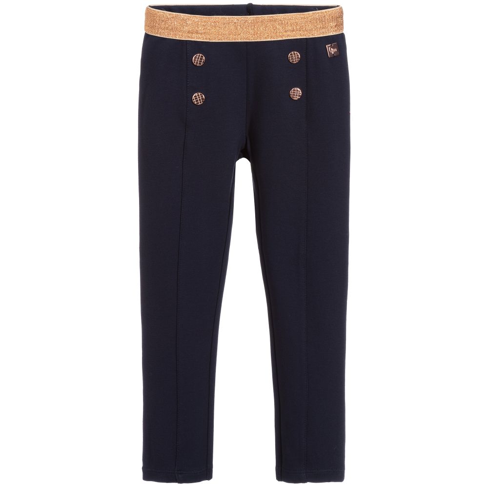 Navy blue trousers for girls by Carrément Beau. They are made in soft Milano jersey and have decorative rose gold button on the front. The sparkly rose gold waistband is elasticated and adjustable.