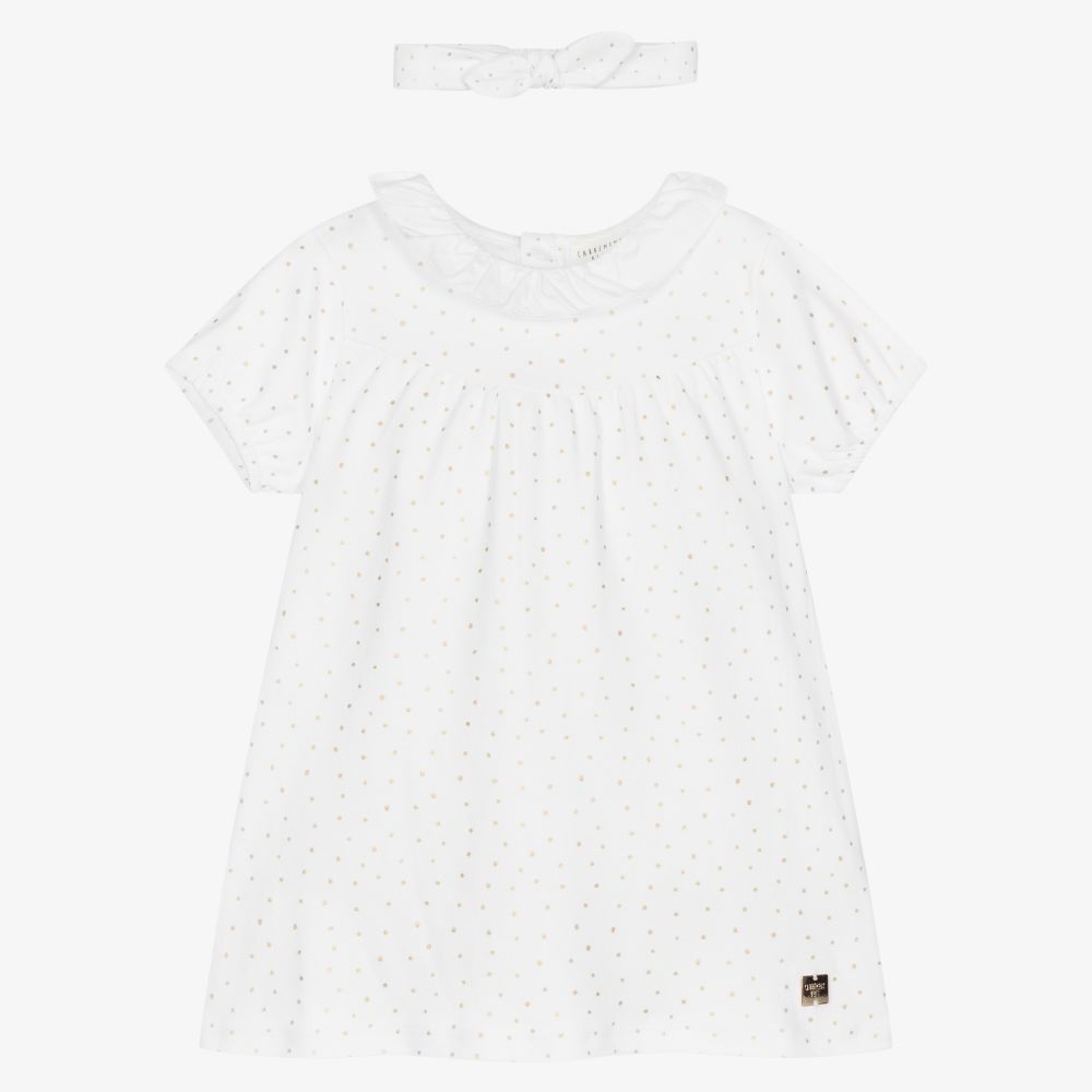 White dress set for girls by French designer Carrément Beau, made in comfortable organic cotton jersey. Patterned with shiny gold dots, it has a ruffled poplin collar and the brand's logo tab sewn into the hem. There are popper fastenings on the back. The set comes with a matching headband with a fixed, knotted bow.