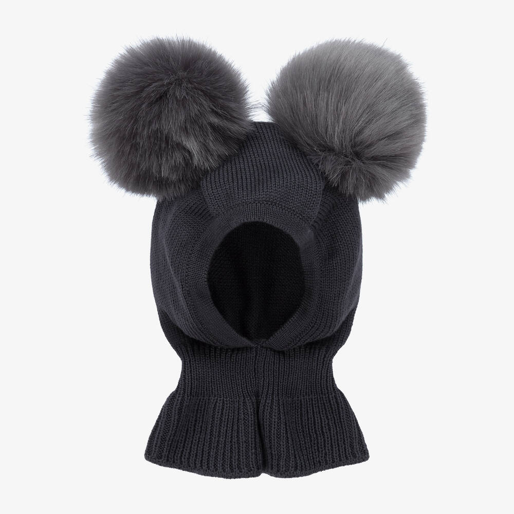 Dark grey balaclava for girls by Italian brand Catya, knitted in soft Merino wool. With a warm, ribbed neckline, this cosy cold weather accessory has two large faux fur pom-poms on the top.
