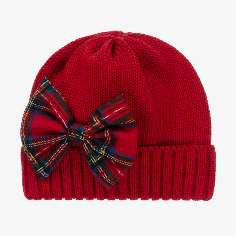 A sweet red beanie hat for girls by Italian brand Catya, knitted in soft and stretchy Merino wool. Great for the colder temperatures, this cosy accessory has a fixed turn-up brim and a pretty red tartan bow on the front for a traditional touch.
