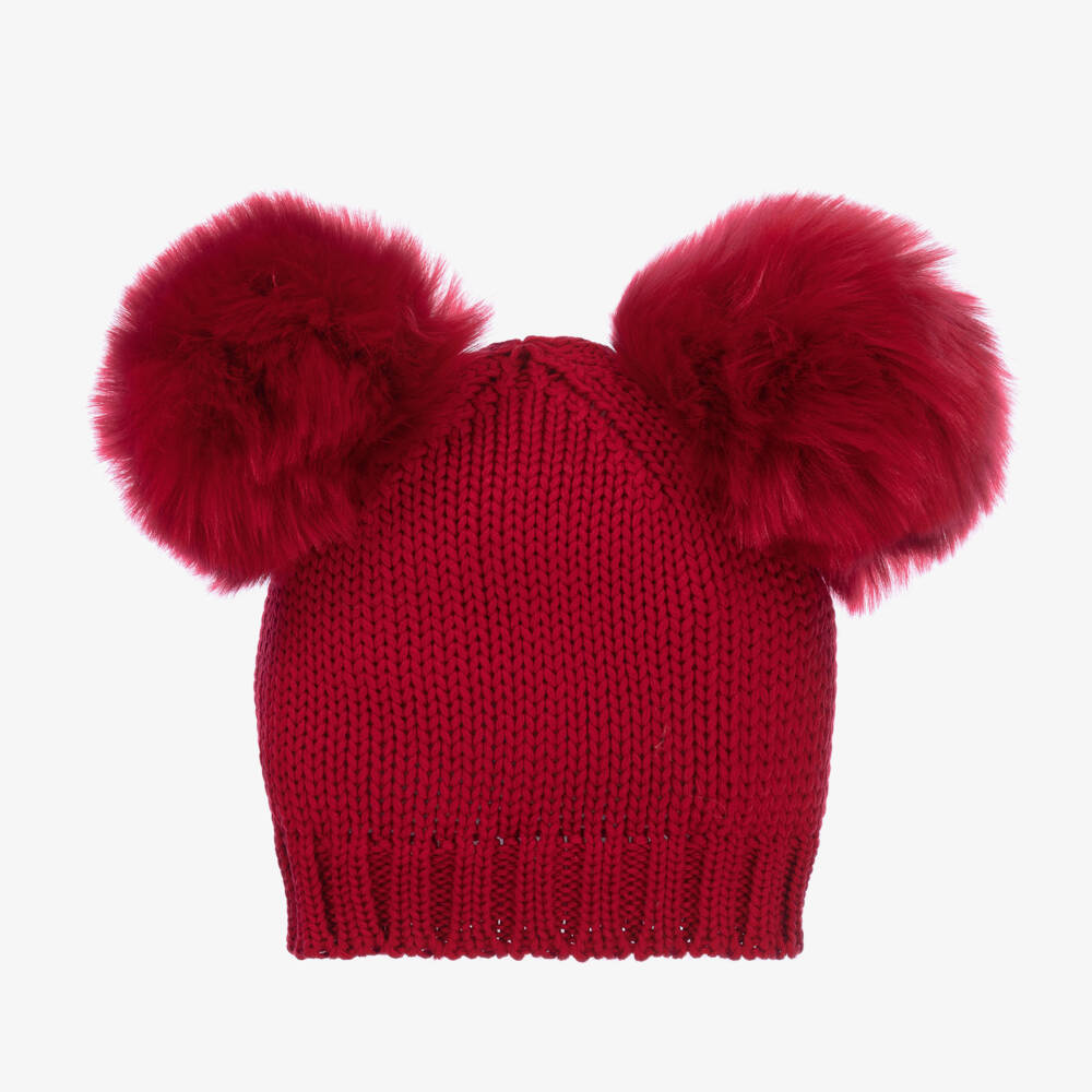 A fun red hat for girls by Italian brand Catya, knitted in soft Merino wool. This cosy accessory has large faux fur pom-poms on the top. The ribbed edge has extra stretch for a comfortable fit and feel.