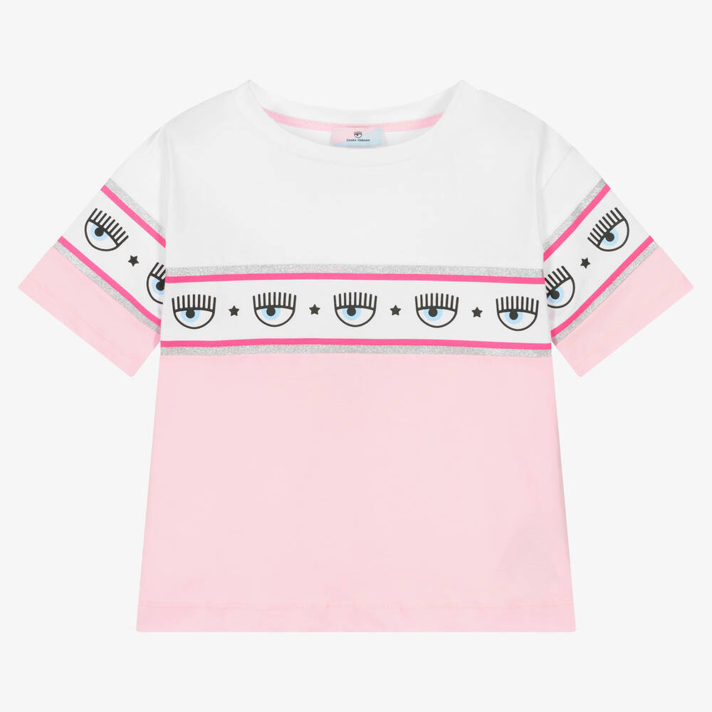 A pink and white T-shirt for girls by Italian brand Chiara Ferragni Kids. In an eye-catching design, the brand's iconic Eyestar logo is repeated around the chest and and sleeves, with a pink and glittery silver trim. Casual and comfy, the top is made in soft cotton jersey.