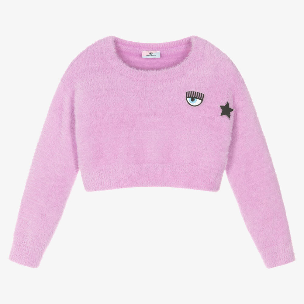 Eye-catching lilac purple cropped sweater for girls, instantly recognisable as by Italian brand Chiara Ferragni Kids. Super soft and fluffy, it feels wonderful to wear and has the brand's rubberised Eyestar logo on the front.