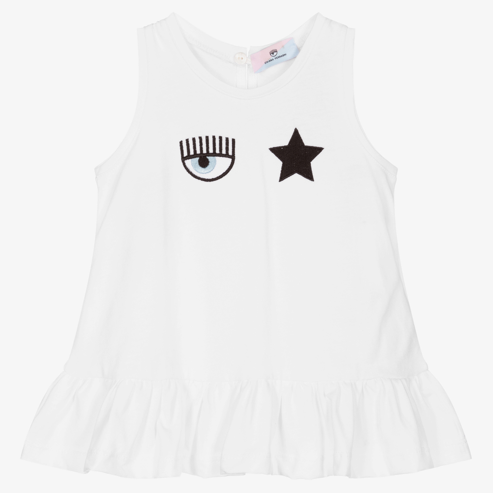 Girls white sleeveless tunic T-shirt by Chiara Ferragni Kids, in a pretty 'A'-line style. Made in soft, stretchy cotton jersey, it has a cute black Eyestar embroidery on the front. There is a wide ruffled hem and a single button fastening on the back.