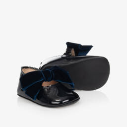 Exclusive to Childrensalon, a pair of white leather pre-walker shoes for baby girls from Children's Classics. These pretty ballerinas have a velcro fastening strap, decorated with velvet bows and are fully lined in leather, with a smooth leather outer sole.