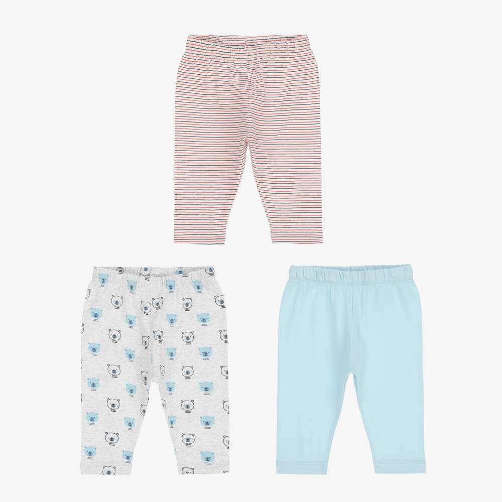 Pack of three pale blue, red and grey full length leggings for baby girls and boys by Childrensalon Essentials, patterned with bears or stripes. They are made in beautifully soft, organic cotton jersey for comfort and are presented in fully biodegradable packaging.