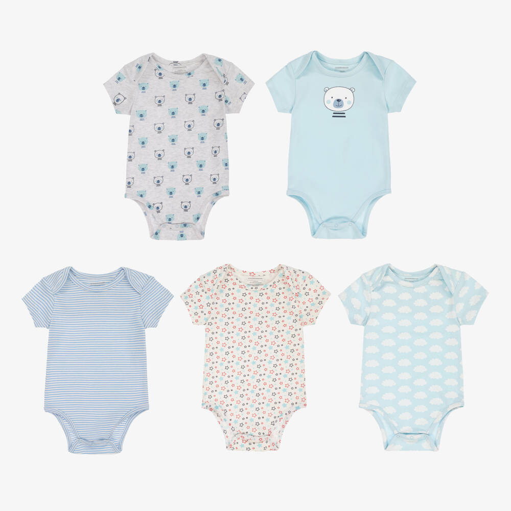 Pack of five organic cotton bodyvests for baby boys and girls by Childrensalon Essentials. They are made in beautifully soft blue, grey or ivory jersey patterned with cute bears, stars, stripes or clouds. All the bodyvests have useful envelope necklines and popper fastenings between the legs. They are presented in fully biodegradable packaging.