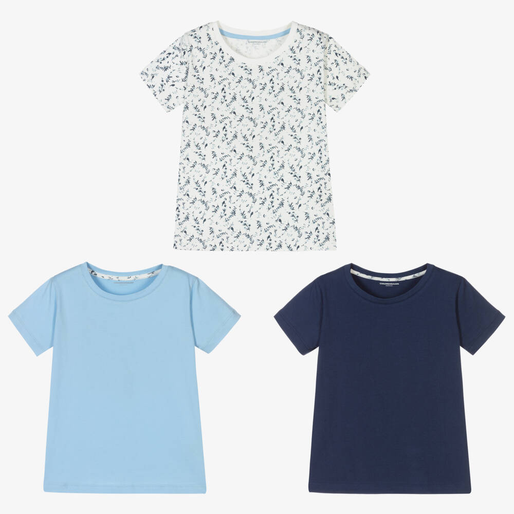 Pack of three casual, short-sleeved T-shirts for girls by Childrensalon Essentials, made in soft, stretchy organic cotton jersey. One is navy blue, one is light blue and the third is ivory with a navy blue floral bird pattern. The T-shirts are presented in fully biodegradable packaging.