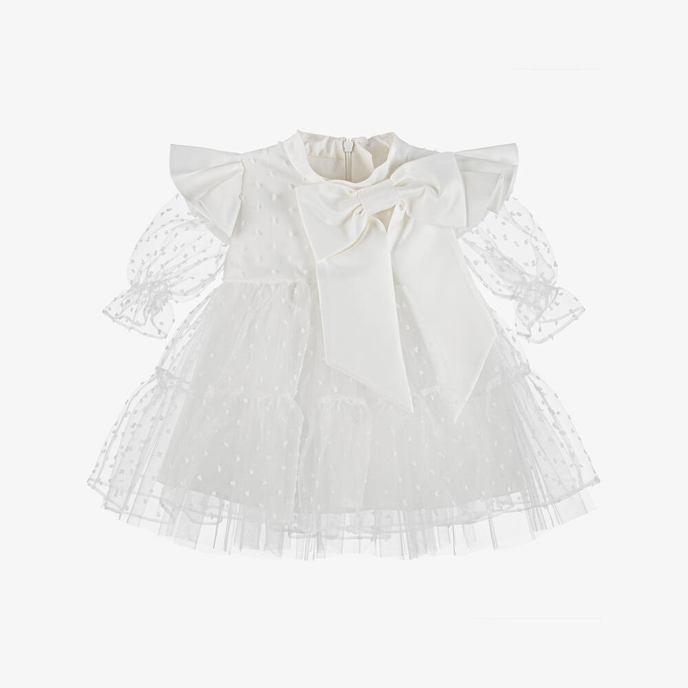 Baby girls white dress by Childrensalon Occasions, made in beautiful, sheer organza patterned with plumetis. It has a white satin underlayer on the bodice, wonderful white satin ruffles over the shoulders and a large, matching satin bow on the neckline. The puffed sleeves are three-quarter length, with gently elasticated, frilled cuffs, and the tiered organza skirt is full and gathered, with a soft tulle underskirt for added volume. The dress is lined in lightweight cotton for comfort and fastens with a zip on the back.