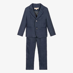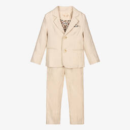 Summery beige suit and tie for boys by Childrensalon Occasions. Smartly tailored and made in cool, comfortable linen, this stylish suit has a button-fastening jacket, with a chest pocket that has a removable paisley handkerchief. The jacket has a coordinating paisley lining for comfort. The trousers have both front and back pockets, and fasten with a button and zip. The waistband is adjustable for a great fit and has useful belt loops. A matching paisley tie comes with the suit. Smaller sizes have an elasticated neck strap, whilst larger sizes have an adjustable strap.
