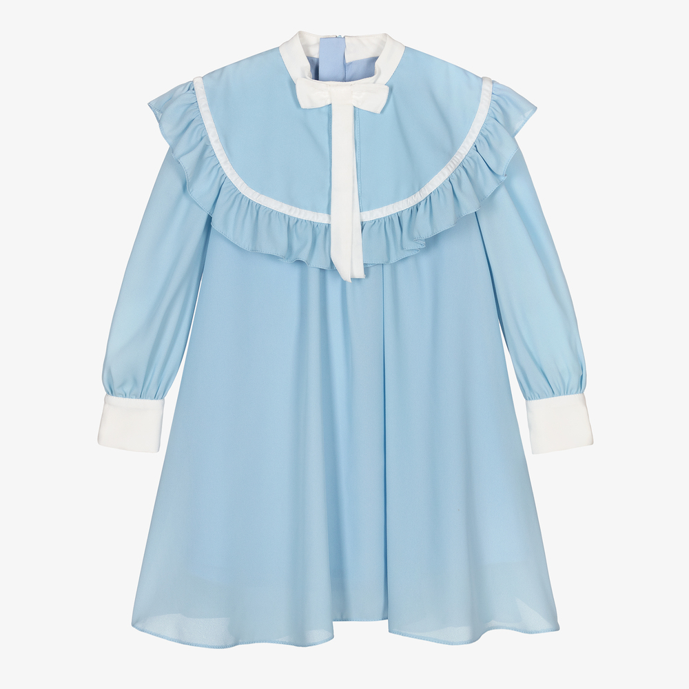 Pale blue trapeze dress for girls by Childrensalon Occasions, ideal for a special event. Made in soft, lightweight crêpe, this pretty dress has a large, frill-trimmed collar, a fixed, white velvet bow and decorative buttons on the bodice. It has a lightweight cotton voile lining for comfort and a concealed zip fastening on the back.